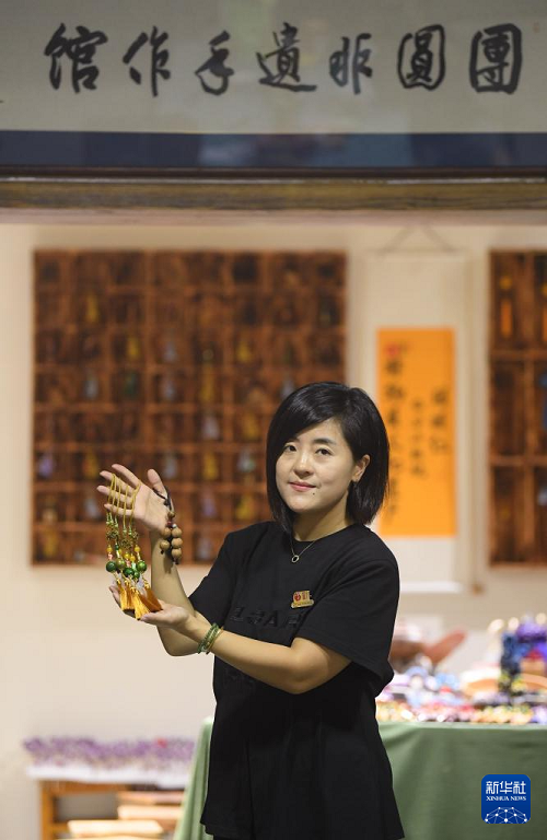 9月9日,在临安龙岗镇一家山核桃生产企业,负责人陈洁展示利用山核桃空籽制作的文创产品。(新华社记者 翁忻旸 摄)