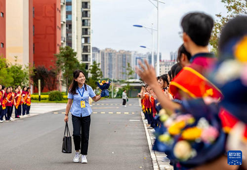9月10日,学生在贵州省黔西第一中学列队欢迎到校教师。(新华社发 范晖 摄)