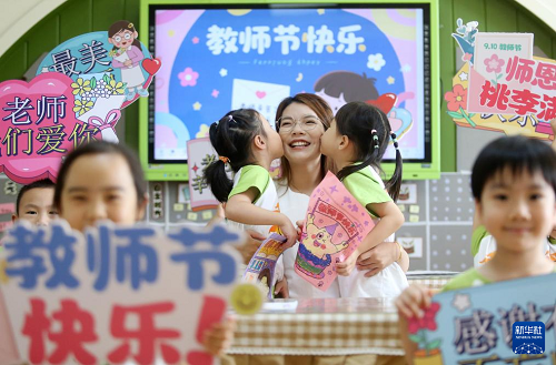 9月10日,在江苏省扬州大学附属西郡幼儿园,小朋友亲吻老师。(新华社发 孟德龙 摄)