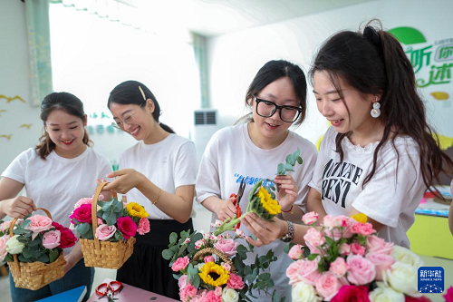 9月10日,在江苏省泰州市姜堰区第四中学,老师们参加教师节主题插花活动。(新华社发 周社根 摄)