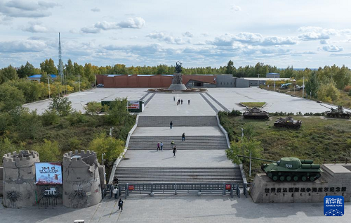 9月18日,人们在内蒙古呼伦贝尔市海拉尔区世界反法西斯战争海拉尔纪念园参观(无人机照片)。(新华社记者 贝赫 摄)