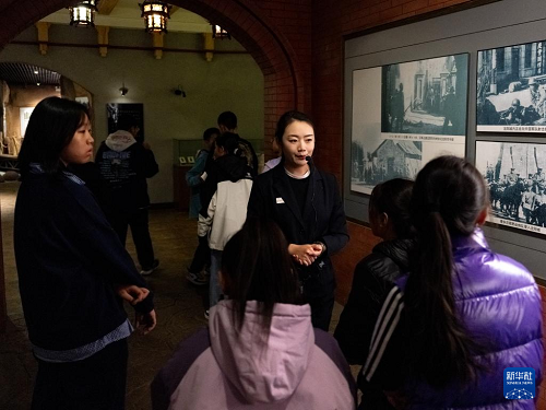 9月18日,在内蒙古呼伦贝尔市,讲解员为参观世界反法西斯战争海拉尔纪念园的小学生讲解。(新华社记者 马金瑞 摄)