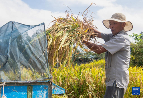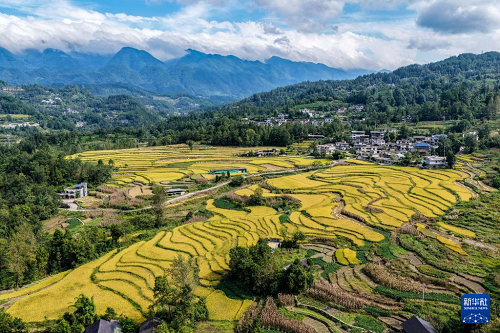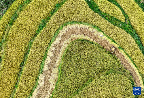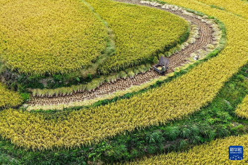 地处武陵山区腹地的重庆市黔江区五里镇水稻种植面积5300亩,是武陵山地区粮食主要产区之一。秋收时节,金黄色的水稻铺满山坡,稻农们利用晴好天气抢收稻谷,呈现出一派美丽的丰收画卷。