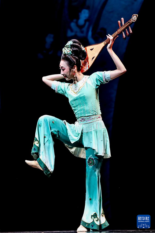 9月20日晚,演员在敦煌大剧院表演新版《丝路花雨》,展示经典舞姿“反弹琵琶”。(新华社记者 郎兵兵 摄)