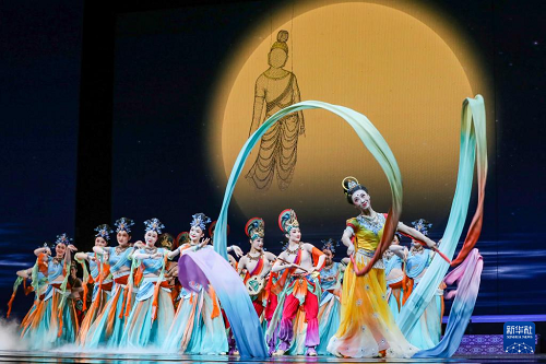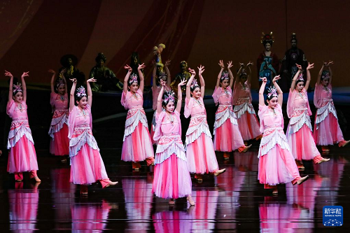 9月20日晚,演员在敦煌大剧院表演新版《丝路花雨》。(新华社记者 郎兵兵 摄)