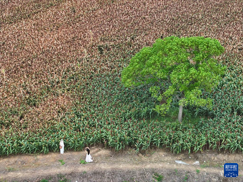 9月21日,游人在高粱地打卡拍照(无人机照片)。(新华社记者 季春鹏 摄)