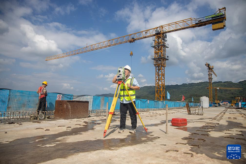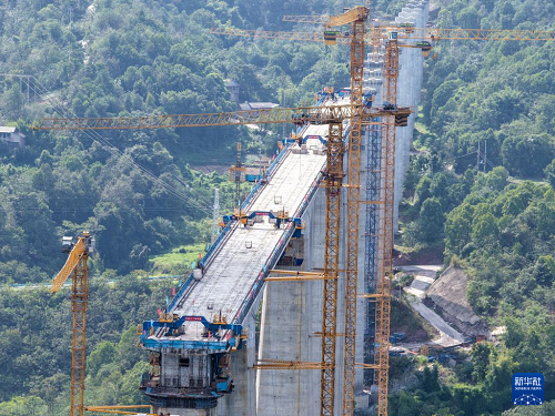 9月24日,工人在渝万高铁五步河双线特大桥建设现场施工作业。(新华社记者 唐奕 摄)