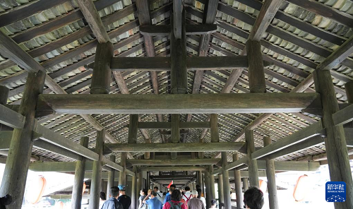 9月25日,游人行走在三江侗族自治县程阳永济桥上。(新华社记者 张枫 摄)