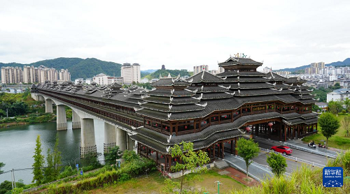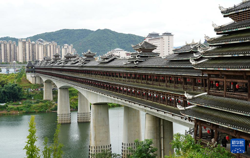 这是9月25日拍摄的三江侗族自治县的程阳永济桥。该桥建成于1924年,整座桥梁搭建时不用一钉一铆,主要由木料和石料建成,桥长近80米,宽近4米,高近12米,是我国建筑艺术中的珍品。(新华社记者 张枫 摄)