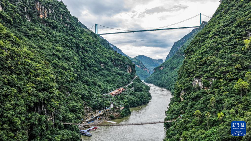 景区内的索道桥与远处的花江峡谷大桥遥相呼应(9月27日摄,无人机照片)。(新华社记者 陶亮 摄)