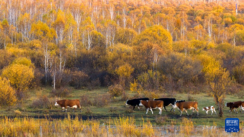 9月25日,在内蒙古呼伦贝尔市额尔古纳市恩和俄罗斯族民族乡,牛群在林间吃草(无人机照片)。(新华社记者 马金瑞 摄)