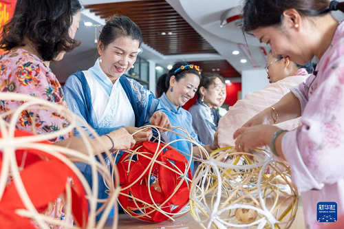 9月28日,在浙江省温岭市横峰街道马鞍桥村文化礼堂,居民们制作“滚灯”。(新华社发 徐伟杰 摄)