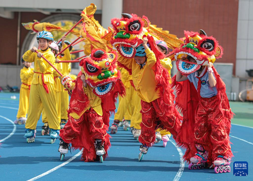 9月29日,在山东省荣成市实验小学,孩子们表演舞龙舞狮。(新华社发 李信君 摄)