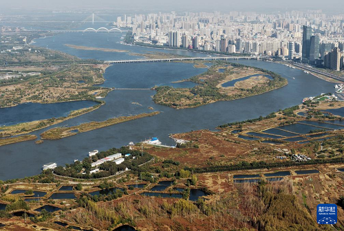 这是10月7日拍摄的哈尔滨群力外滩湿地公园景色(无人机照片)。(新华社记者 王松 摄)