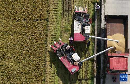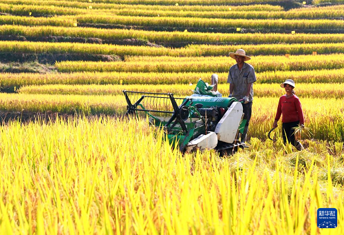 10月10日,湖北省宜昌市秭归县沙镇溪镇长春村村民驾驶农机在田间收获水稻。(新华社发 王罡 摄)