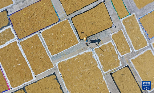 10月10日,浙江省台州市仙居县官路镇增仁村农民在晾晒稻谷(无人机照片)。(新华社发 王华斌 摄)