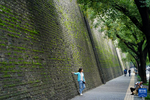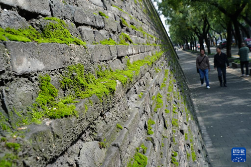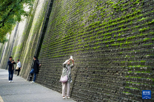 西安城墙始建于隋唐、扩建于明代,是中国现存历史最悠久、保存最完整的古代城垣建筑。连绵秋雨过后,苔藓等植物为西安城墙披上了一层绿色的外衣,吸引市民和游人驻足观看、拍照。