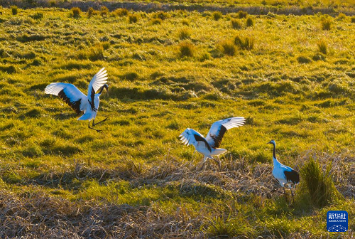 10月9日,在黑龙江挠力河国家级自然保护区,丹顶鹤在湿地中活动(无人机照片)。(新华社发 韩阳 摄)