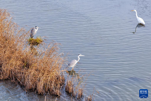 10月14日在黑龙江省同江市三江口国家湿地公园拍摄苍鹭和白鹭。(新华社发 刘万平 摄)