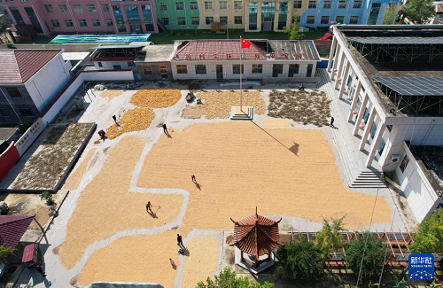 10月14日,农户在山东省临沂市沂南县苏村镇宝珠村广场上晾晒粮食(无人机照片)。(新华社发 尹君 摄)