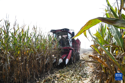 10月14日,河南省济源市五龙口镇农民驾驶农机在田间抢收玉米。(新华社发 苗秋闹 摄)