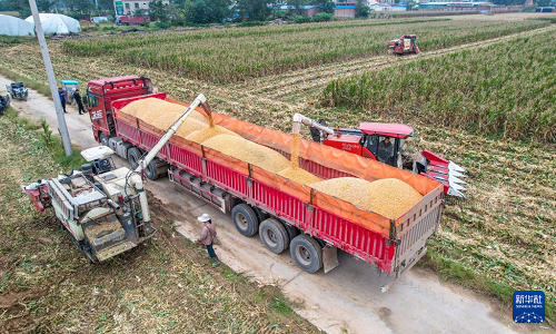 10月14日,在河南省商丘市夏邑县会亭镇,收割机将收获的玉米装车(无人机照片)。(新华社发 王高超 摄)
