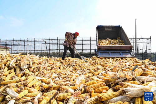 10月14日,河南省济源市五龙口镇农民晾晒刚收获的玉米。(新华社发 苗秋闹 摄)