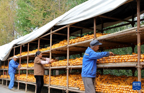 10月14日,在河南省济源市轵城镇中王村,村民将收获的玉米上架晾晒。(新华社发 段二平 摄)