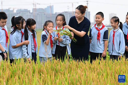 10月15日,江苏省太仓市港城小学老师为孩子们讲解水稻生长知识。(新华社发 计海新 摄)