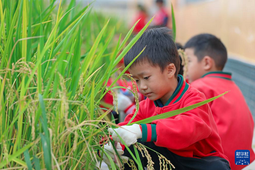 10月15日,云南省曲靖市陆良县大莫古镇中心幼儿园的孩子们在校内劳动基地体验打稻穗。(新华社发 王勇 摄)