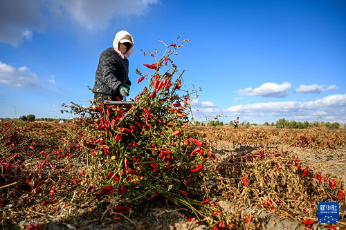 10月19日,在通辽市开鲁县东风镇六合堂村,村民在田地里晾晒红干椒。(新华社记者 连振 摄)