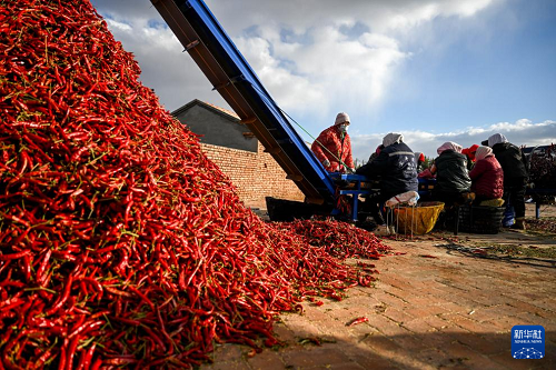 10月19日,在通辽市开鲁县东风镇六合堂村,村民在分拣红干椒。(新华社记者 连振 摄)