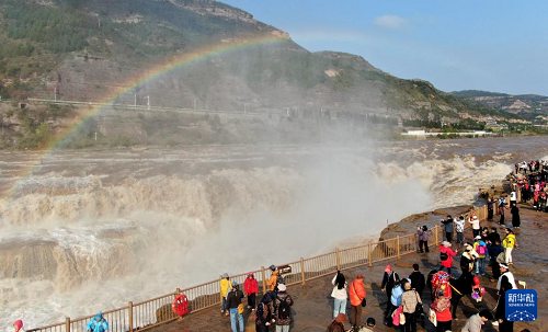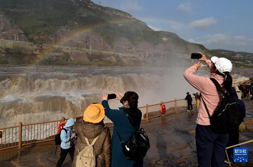 10月27日,游客在山西吉县黄河壶口瀑布景区欣赏“彩虹桥”景观。(新华社发 吕桂明 摄)