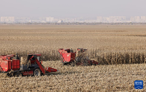 10月28日,农民驾驶收割机在内蒙古鄂尔多斯市达拉特旗收获玉米。(新华社记者 贾立君 摄)