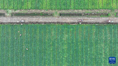 10月30日,菜农在沅江市草尾镇乐园村蔬菜田里采收蔬菜(无人机照片)。(新华社记者 陈振海 摄)