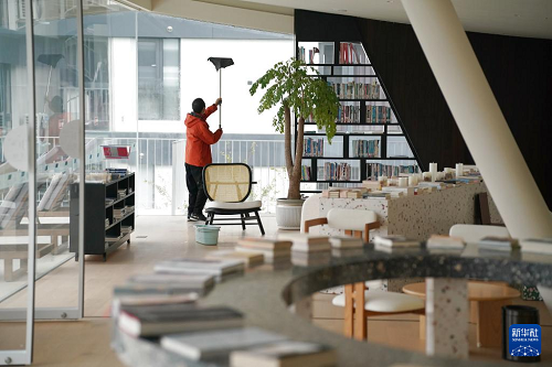 10月29日,在镇坪县牛头店镇国庆村,一家山居酒店工作人员在酒店书吧内打扫卫生。(新华社记者 邵瑞 摄)