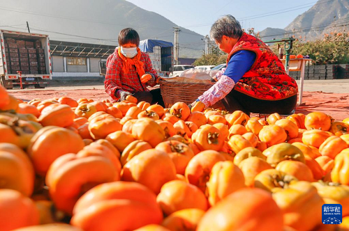 11月1日,河北省遵化市娘娘庄镇芦各寨西山村农民在场院挑选柿子。(新华社发 刘满仓 摄)