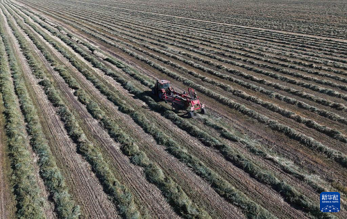 11月1日,工人驾驶拖拉机在甘肃山丹马场二场田间翻晒燕麦草(无人机照片)。(新华社发 陈礼 摄)