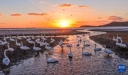 11月2日,在山东省荣成市成山镇天鹅湖湿地,大天鹅在栖息、觅食(无人机照片)。(新华社发 李信君 摄)