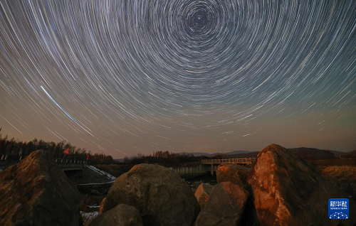 10月31日在黑龙江省伊春市伊美区拍摄的星空下的秋景(堆栈合成照片)。(新华社发 李佳星 摄)