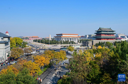 11月3日拍摄的北京天安门广场建筑群及周边的秋色。(新华社记者 陈晔华 摄)