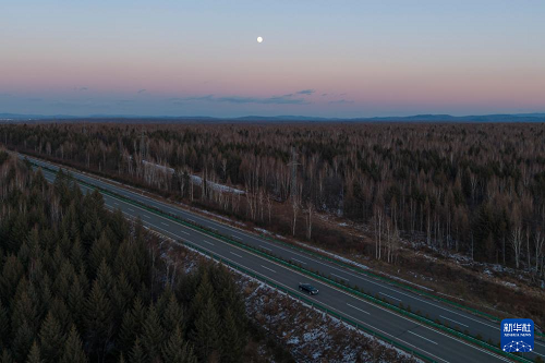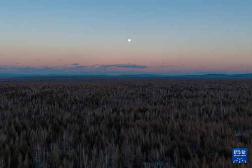 这是11月4日拍摄的黑龙江省伊春市丰林县上空的月亮(无人机照片)。(新华社记者 谢剑飞 摄)