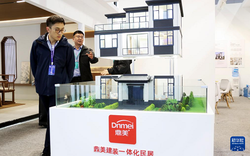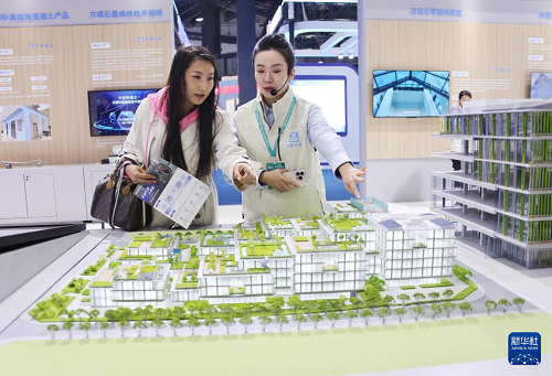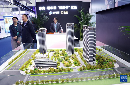 11月6日,参观者在住博会上观看展出的一体化民居模型。(新华社记者 潘旭 摄)