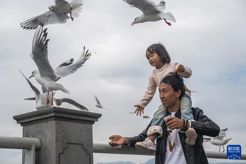 11月10日,游客在云南省昆明市海埂大坝投喂红嘴鸥。(新华社记者 王冠森 摄)