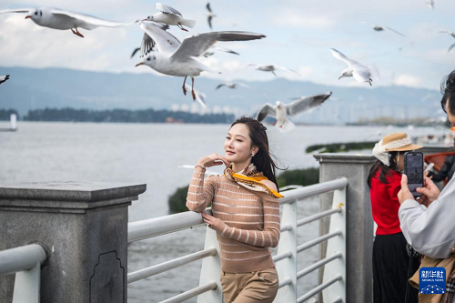 11月10日,游客在云南省昆明市海埂大坝观光留影。(新华社记者 王冠森 摄)