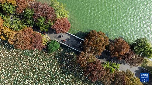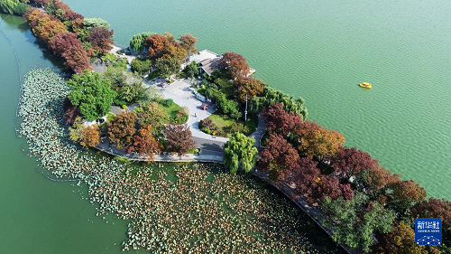 11月10日拍摄的南京玄武湖公园初冬景色(无人机照片)。(新华社发 孙忠南 摄)