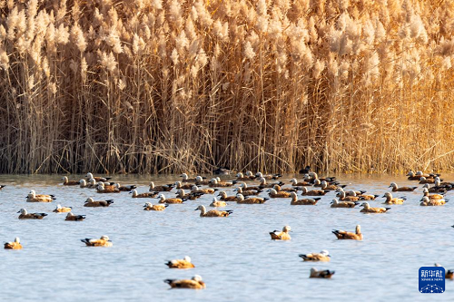 11月12日,赤麻鸭等鸟类在张掖黑河湿地国家级自然保护区高台段一处湖泊休憩觅食。(新华社记者 张智敏 摄)