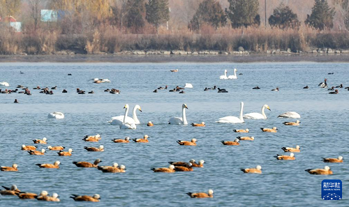 11月12日,大天鹅等鸟类在张掖黑河湿地国家级自然保护区高台段一处湖泊休憩觅食。(新华社记者 张智敏 摄)
