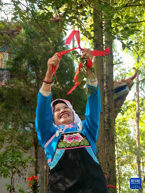 10月29日重阳节,广西南丹县群众按照传统习俗在树木上悬挂福寿带。(新华社发 高东风 摄)