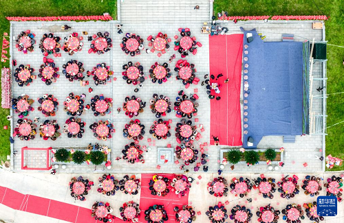 10月29日重阳节,老人们在湖北省秭归县两河口镇太坪村参加长寿宴(无人机照片)。(新华社发 王罡 摄)